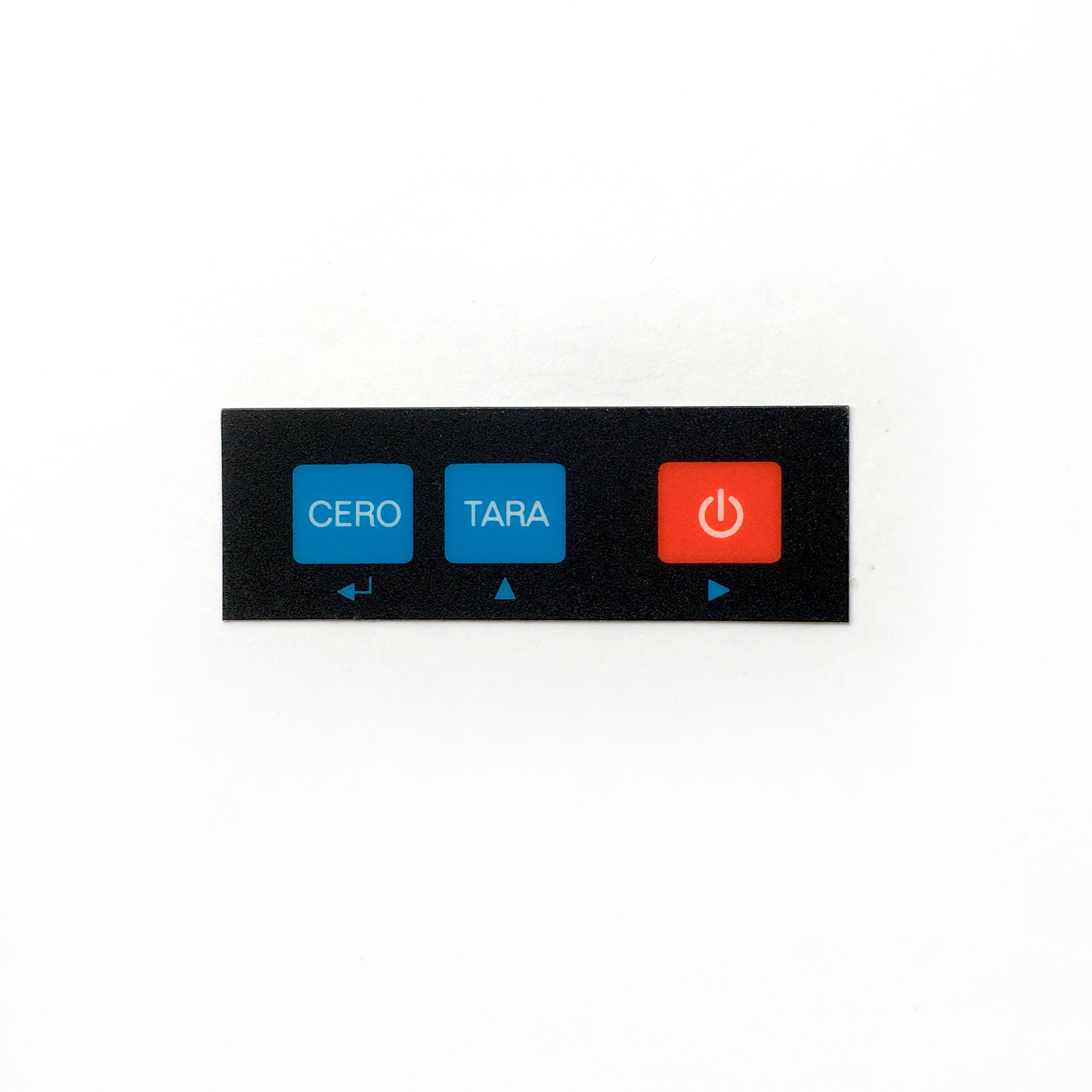Etiqueta autoahesiva de PVC. Para ser utilizado con teclado de tres pulsadores T3TS en modulos EL05B. Teclas: CERO, TARA, ON/OFF.