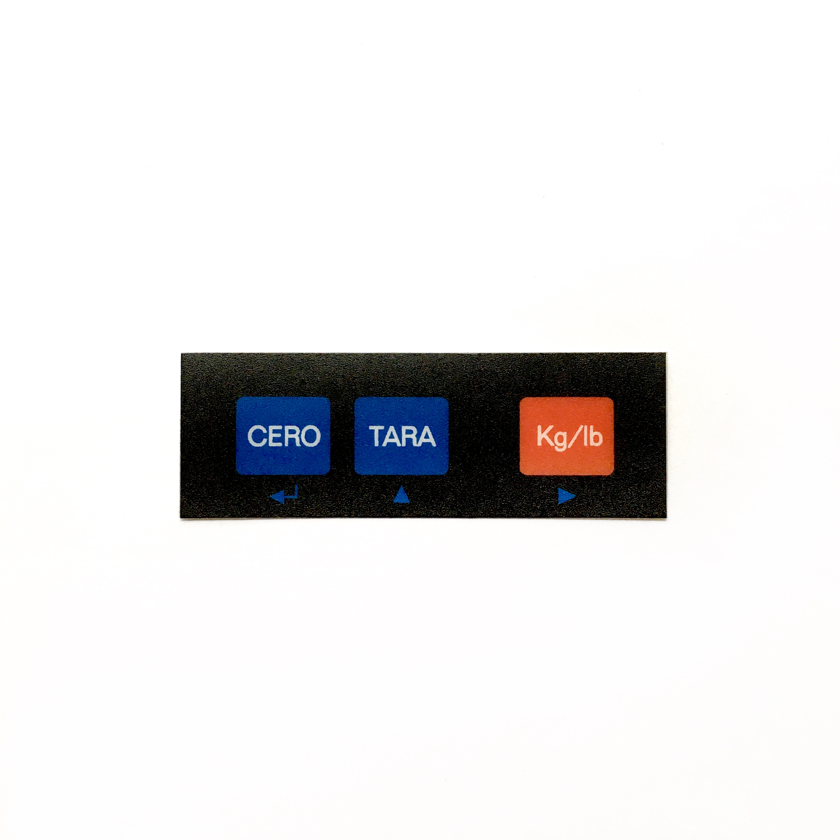 Etiqueta autoahesiva de PVC. Para ser utilizado con teclado de tres pulsadores T3TS en modulos EL05B. Teclas: CERO, TARA, Kg/lb.