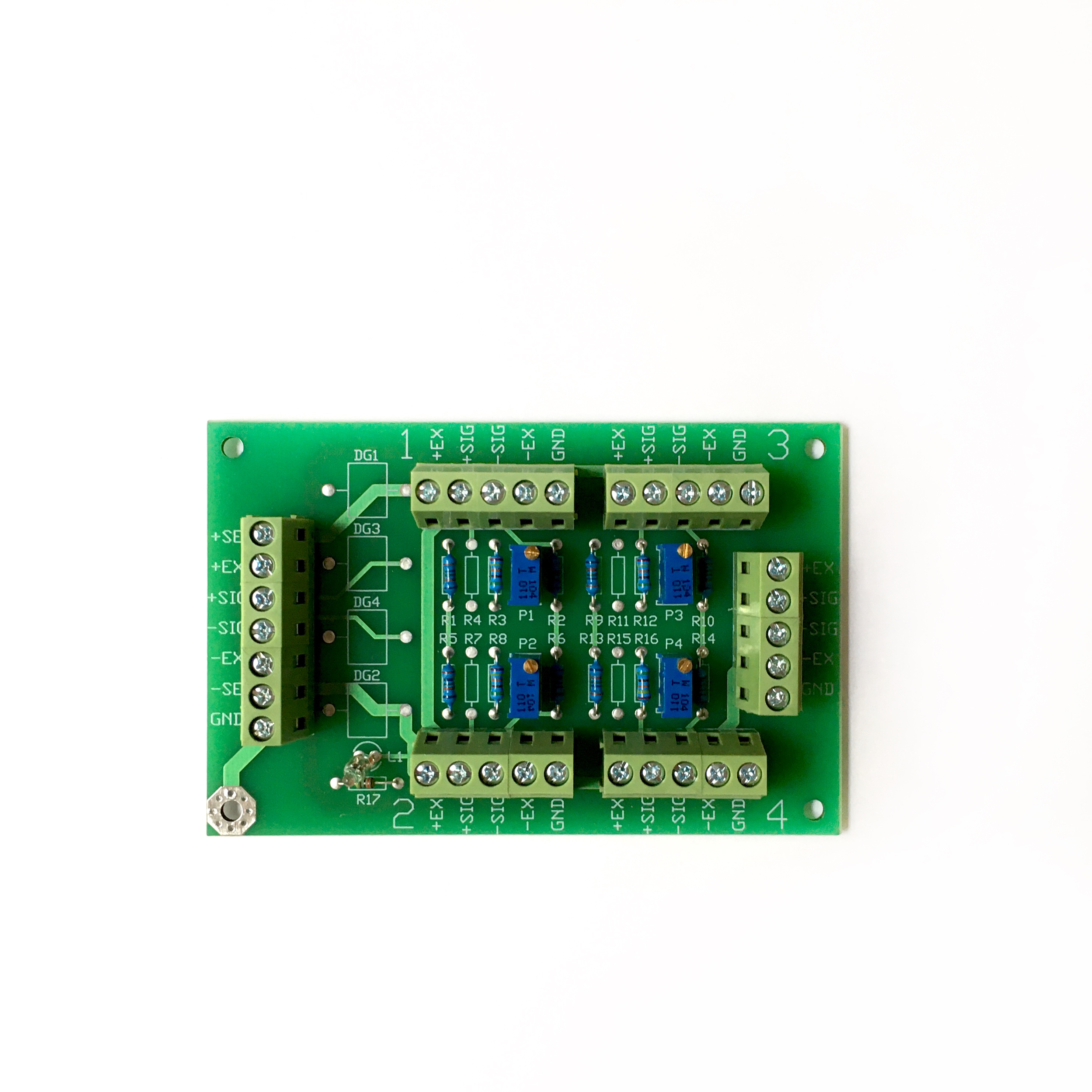 La placa Sumadora de Celdas SC4N permite ecualizar las señales provenientes de hasta 4 celdas de carga. Al conectar en cascada dos o más sumadoras puede ampliarse su capacidad.