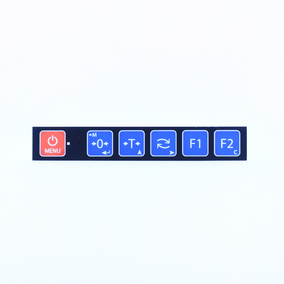 Etiqueta autoadhesiva de PVC. Teclas: POWER/MENU, CERO, TARA, SELECT, F1, F2.
