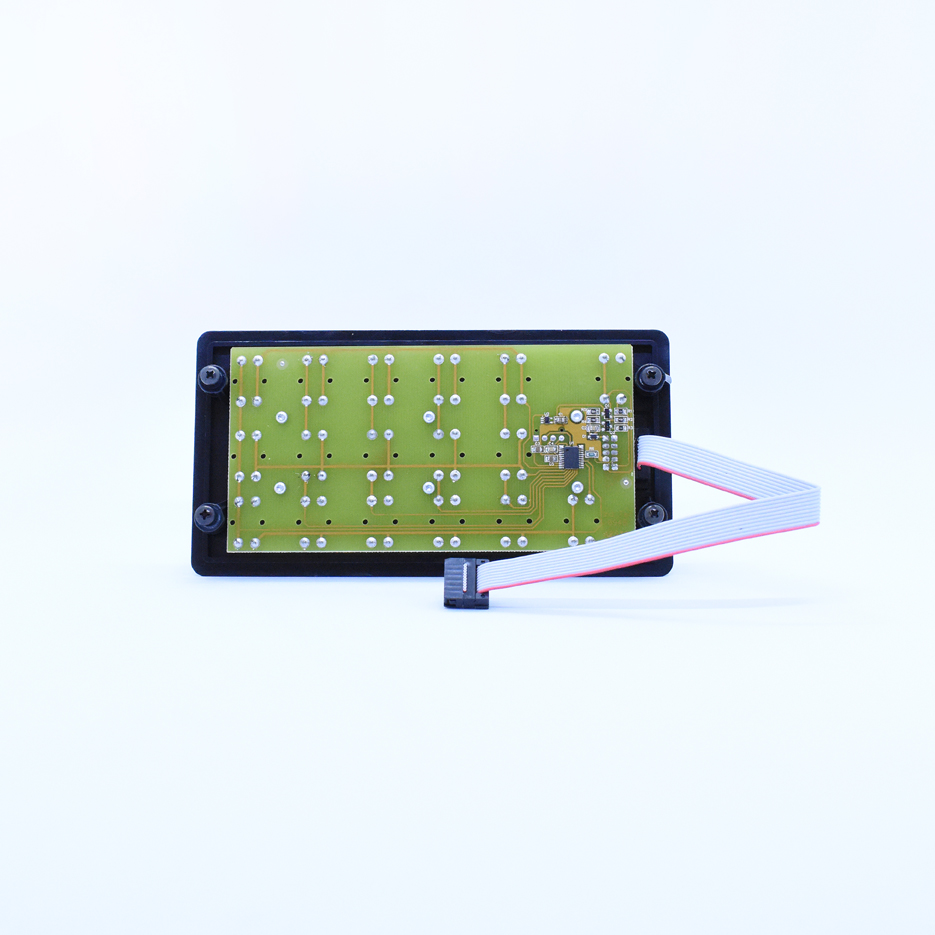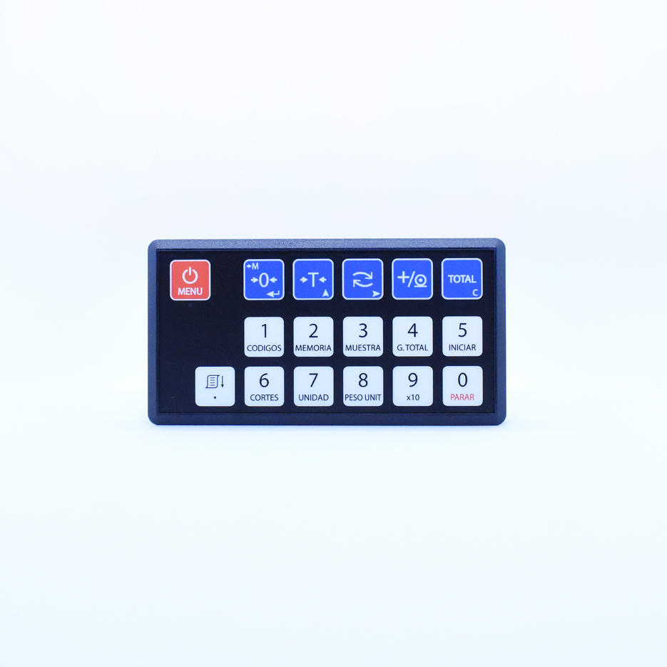 Teclado de 17 pulsadores, incluye bastidor plástico para montaje en gabinete y cable de interconexion a indicador de peso. Teclas: POWER/MENU, CERO, TARA, SELECT, +IMP, TOTAL, teclas 0-9 / acceso directo a funciones, punto/NEXT.